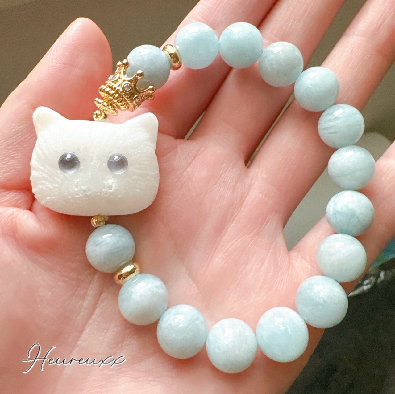 ♡アクアマリン ホワイトジェイド 猫 ブレスレット♡