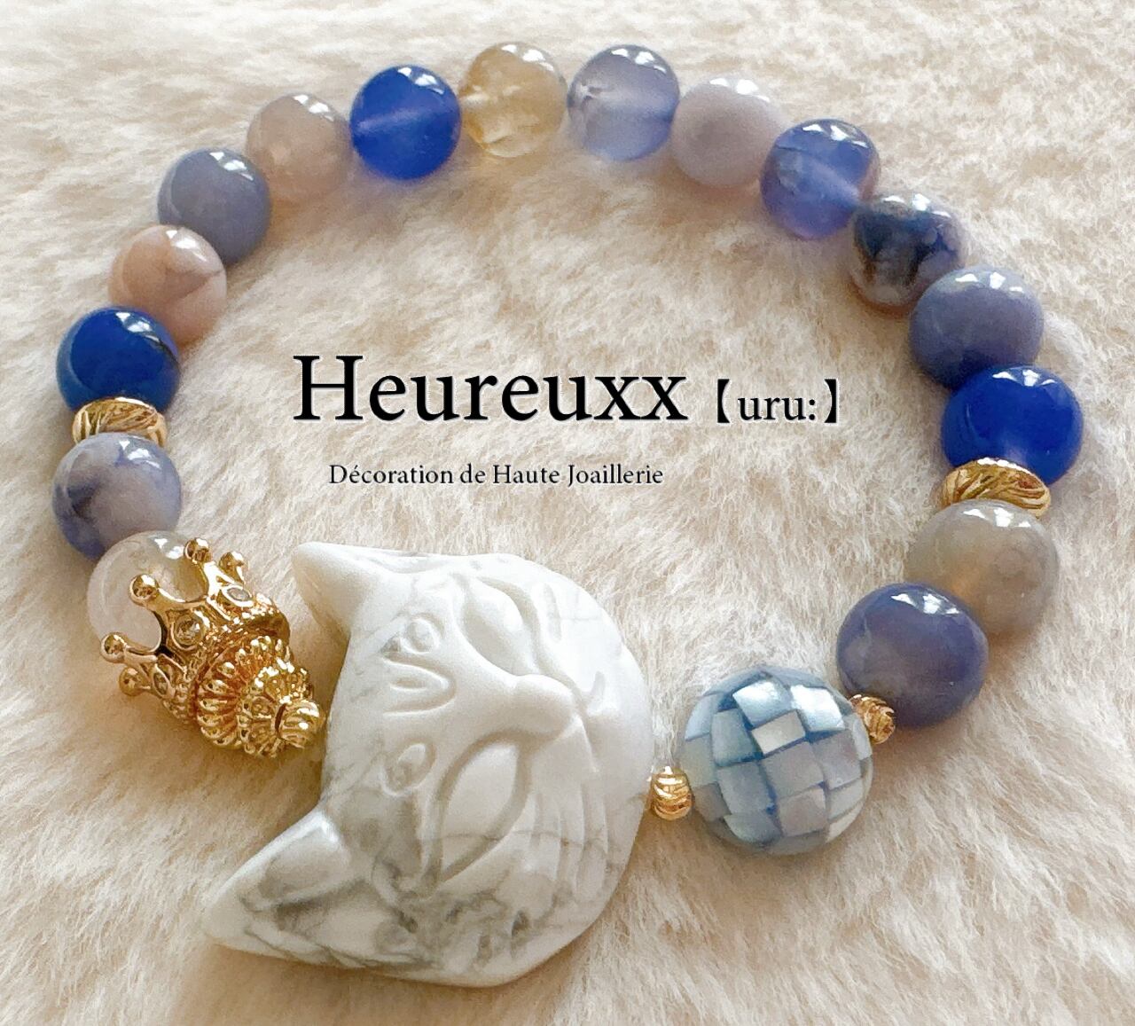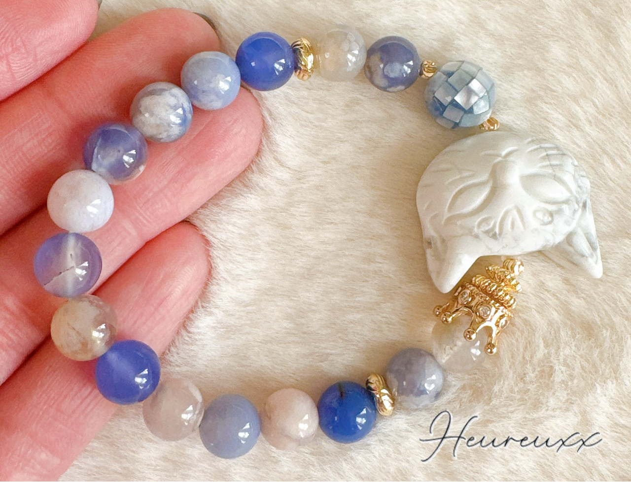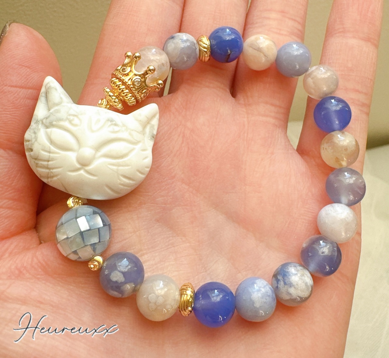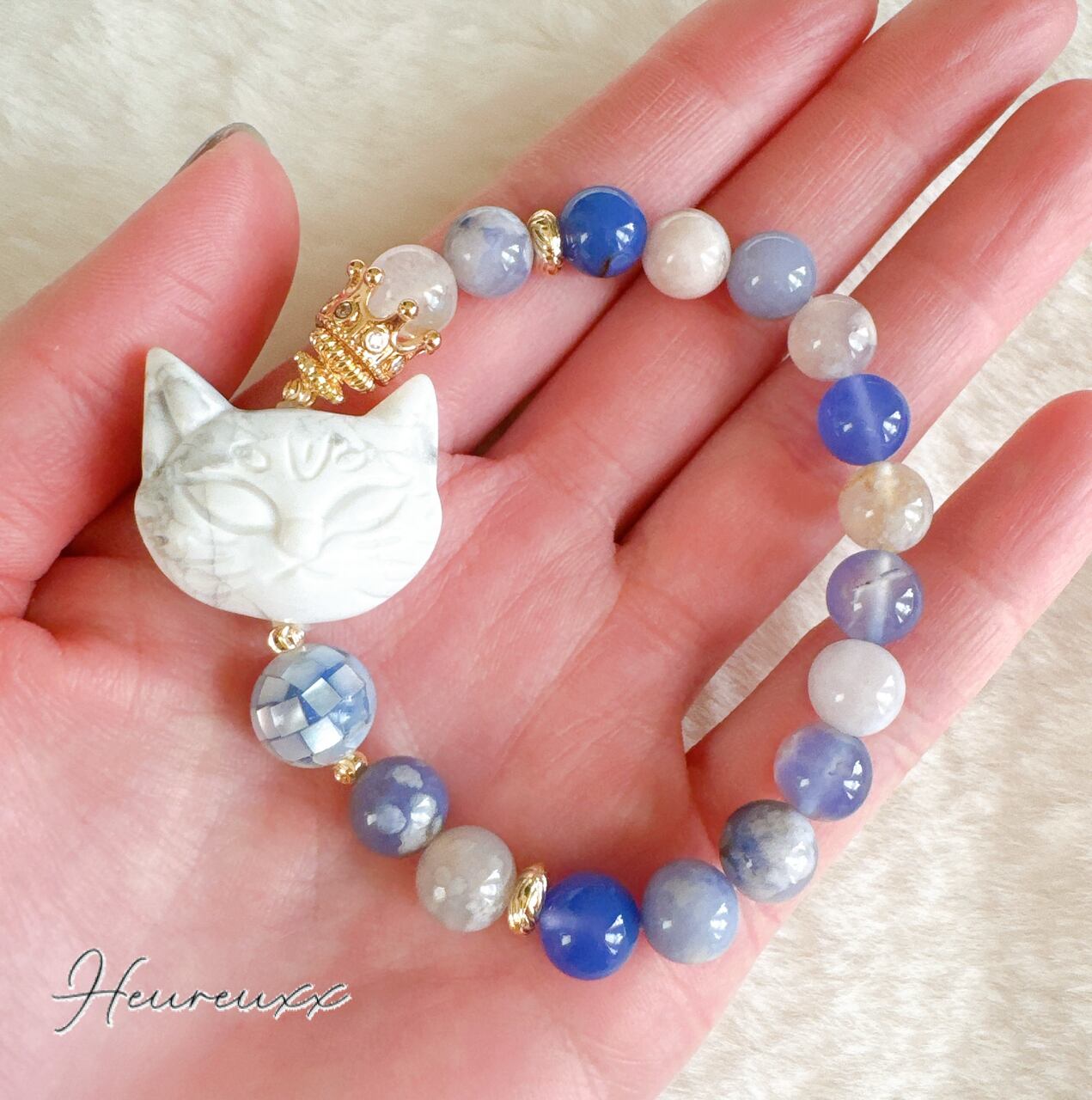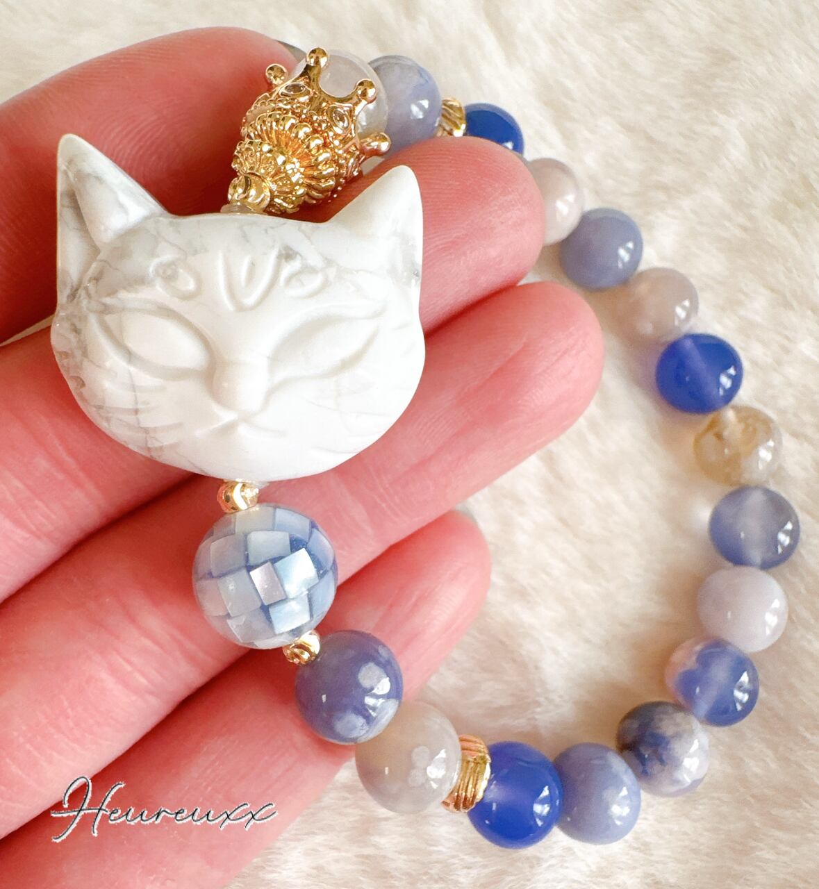 ブルー桜瑪瑙にハウライトの猫を合わせ、モザイクシェルを添えました❁⃘*.゚