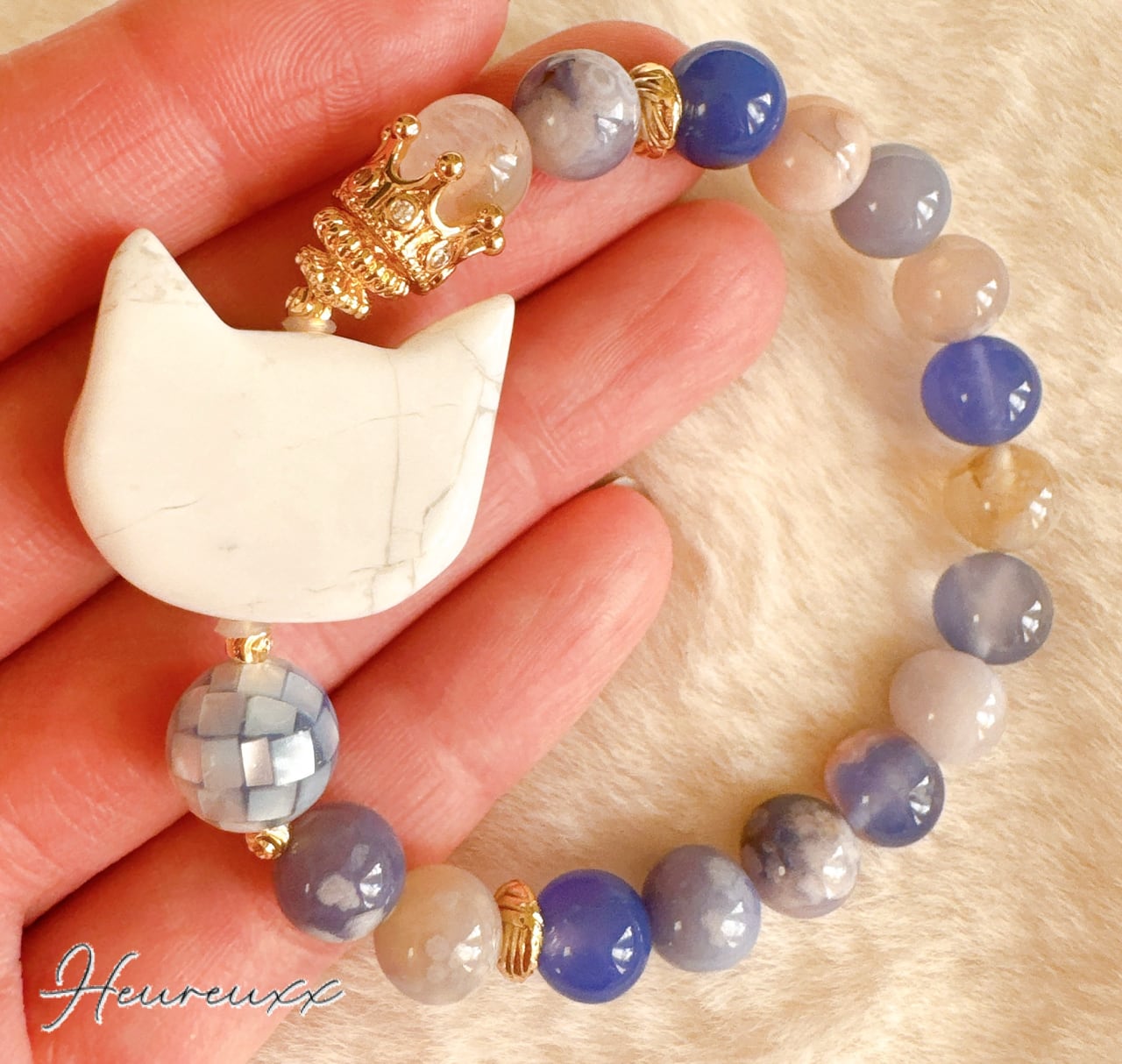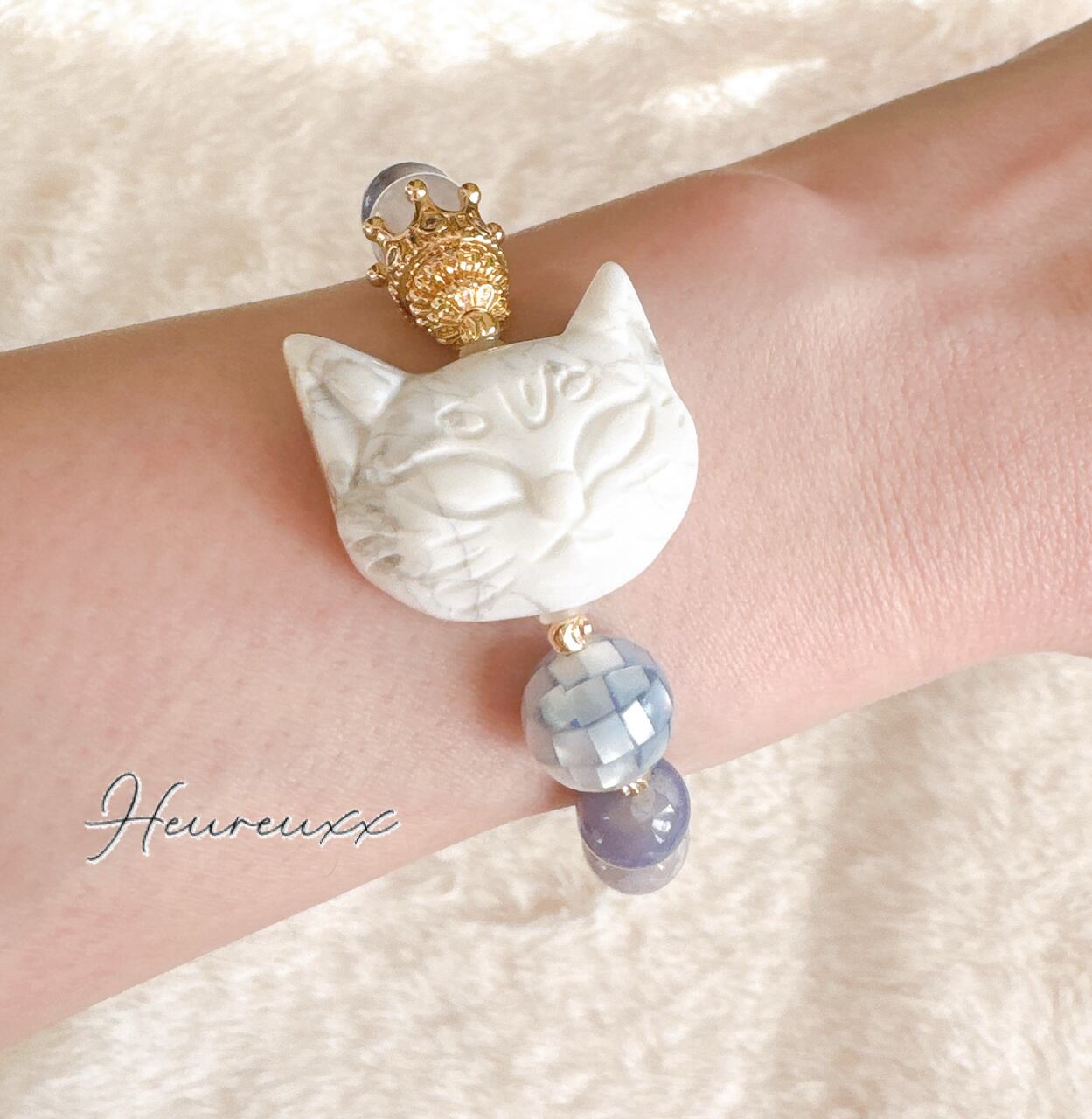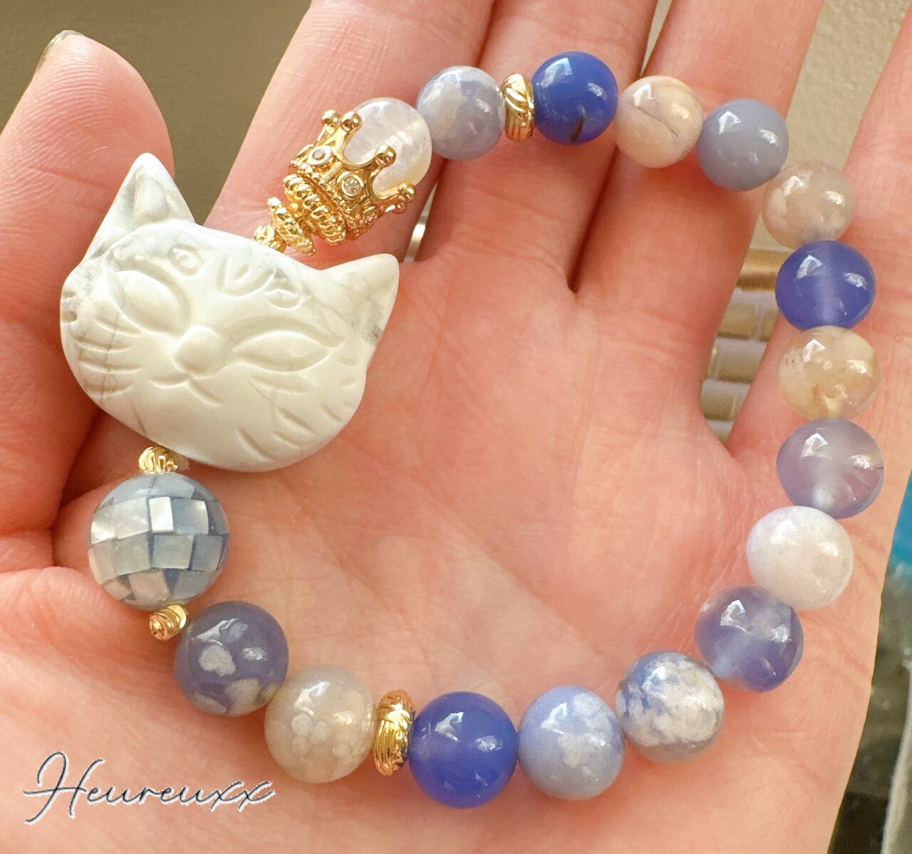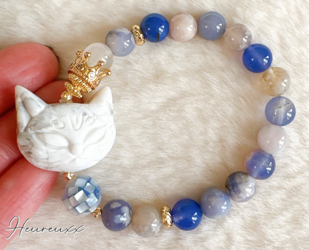 ブルー桜瑪瑙にハウライトの猫を合わせ、モザイクシェルを添えました❁⃘*.゚
