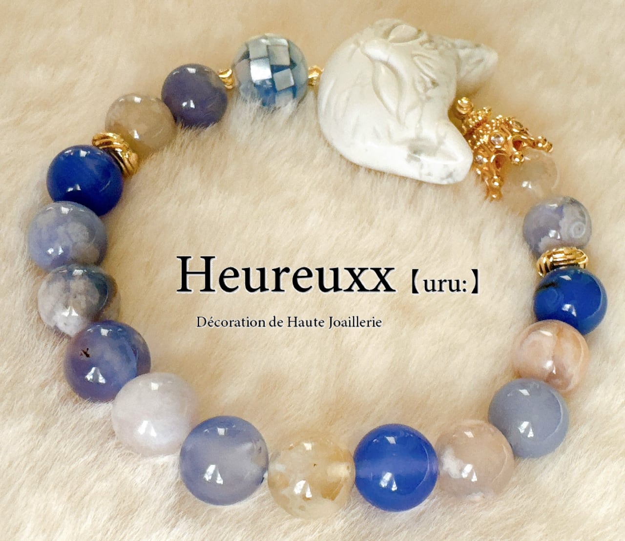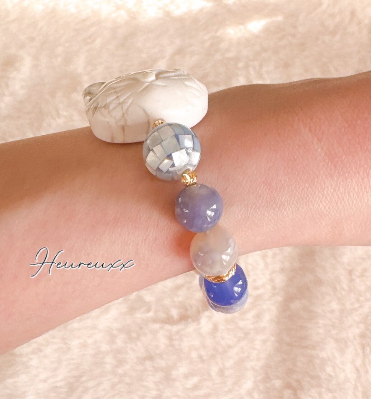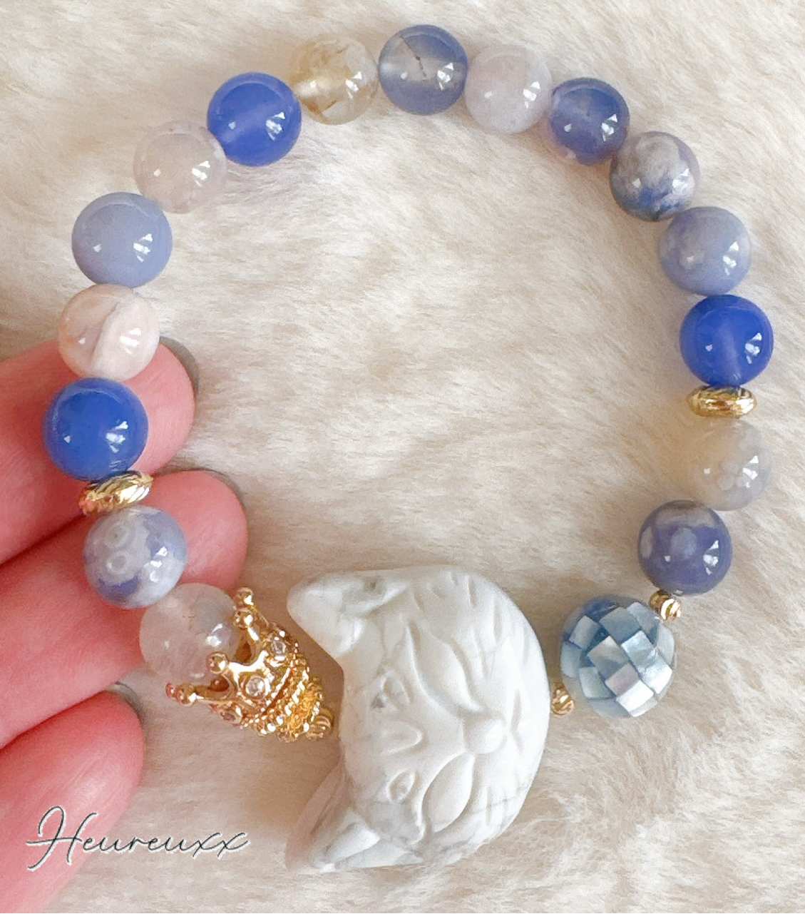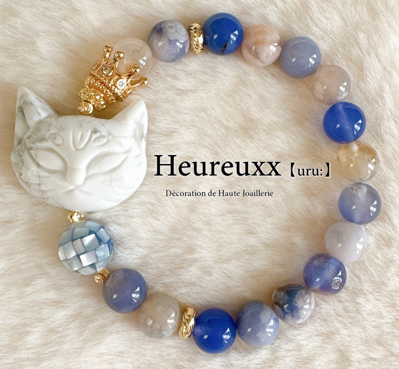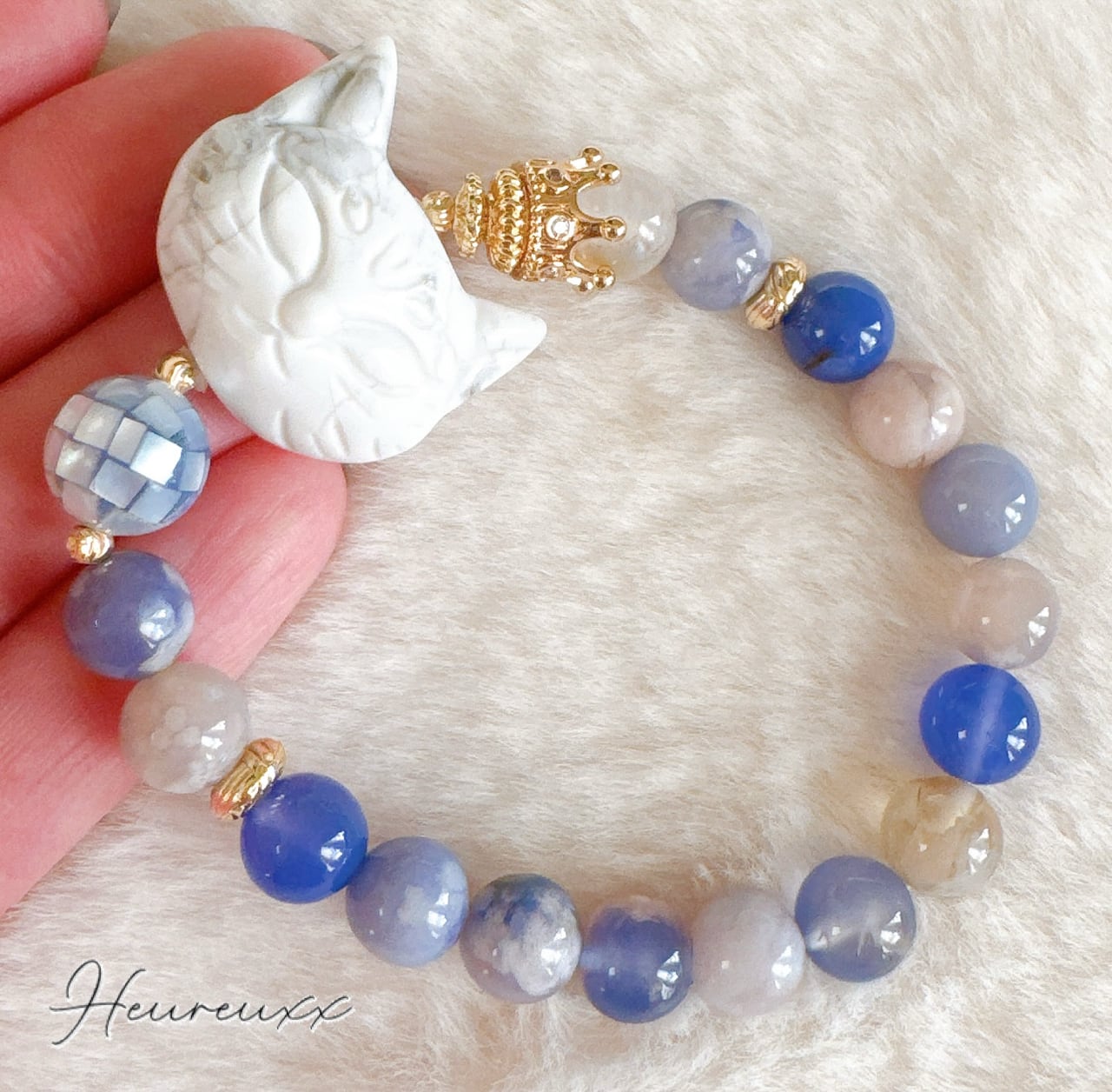 ブルー桜瑪瑙にハウライトの猫を合わせ、モザイクシェルを添えました❁⃘*.゚