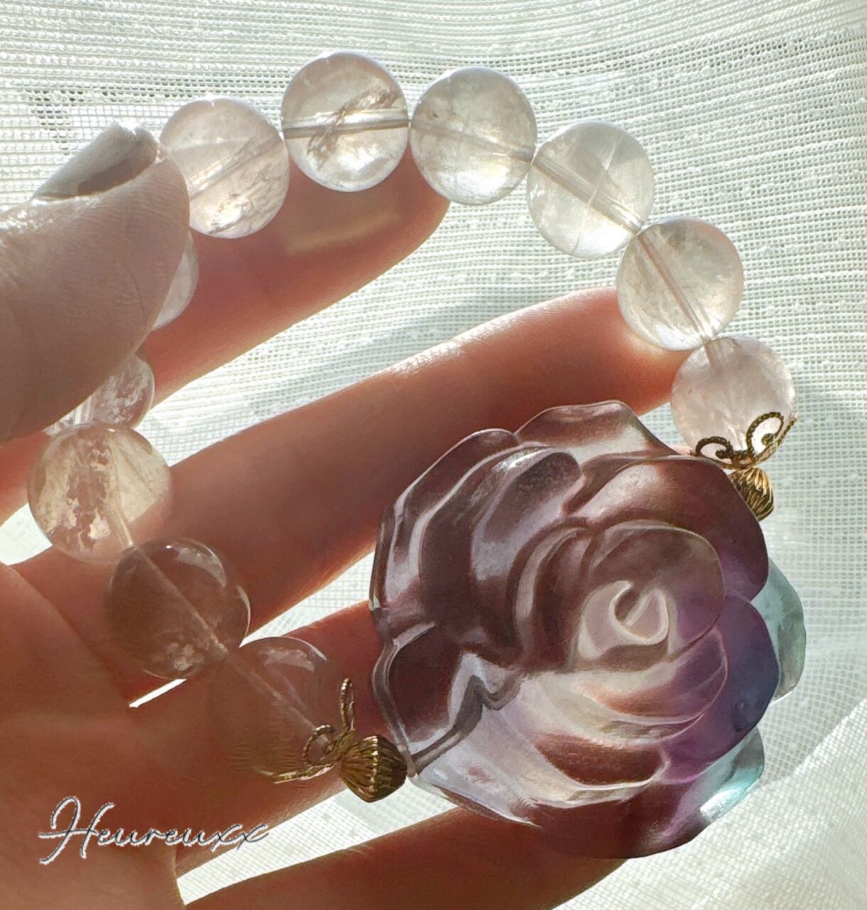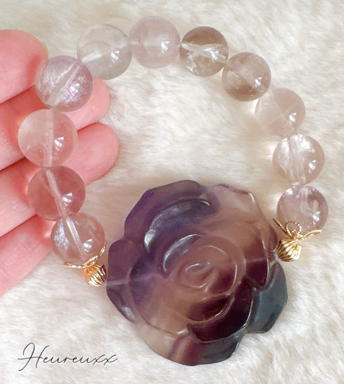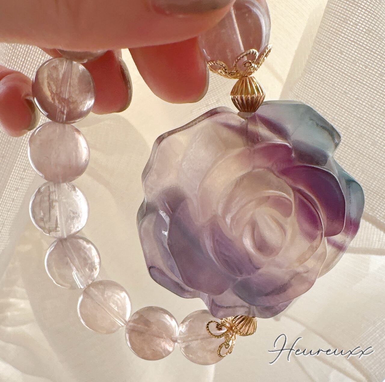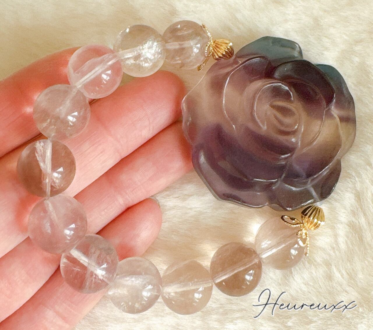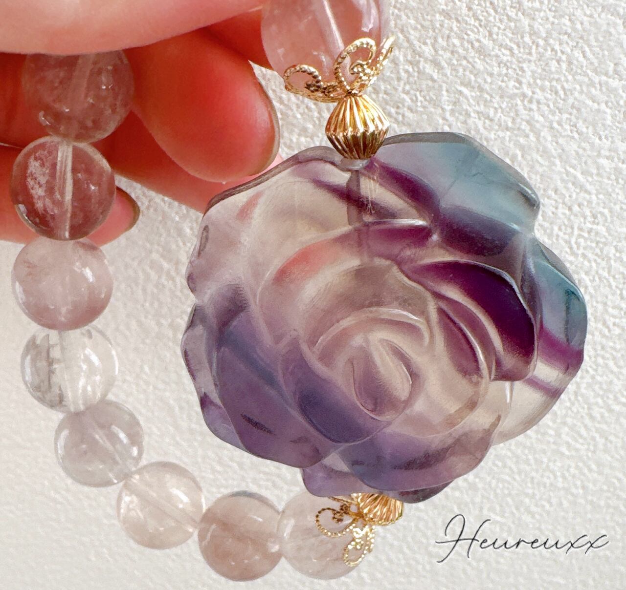 フローライトの薔薇は透明感があり、パープル、ブルー、淡いピンクのバイカラーになっており彫りも立体的でとても綺麗で可愛いです♡