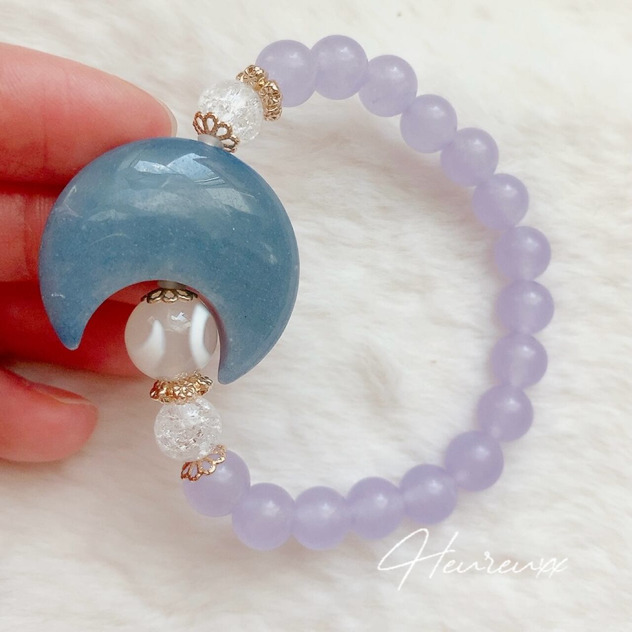 優しい色味のパープルカルセドニーに大きめのブルーアベンチュリンの月のパーツを合わせ、ポイントで月星天珠とクラック水晶を添えました✧*。
