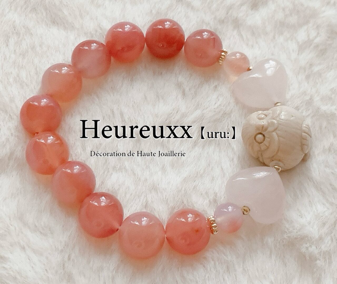 塩源瑪瑙にアラシャン瑪瑙の小鳥のパーツを合わせ、サイドにハートのローズクォーツを添えました❁⃘*.゚