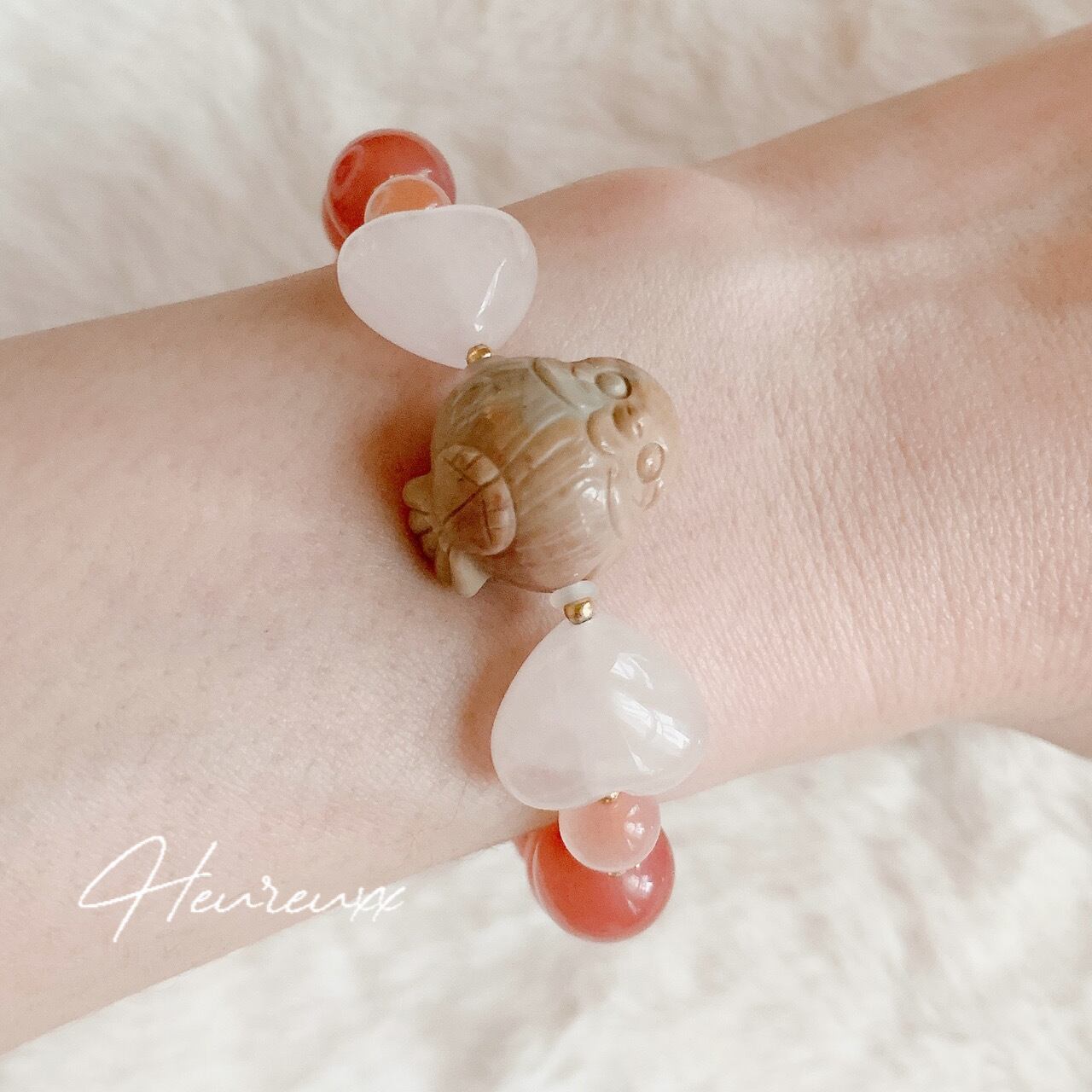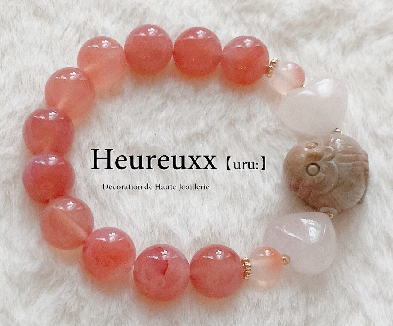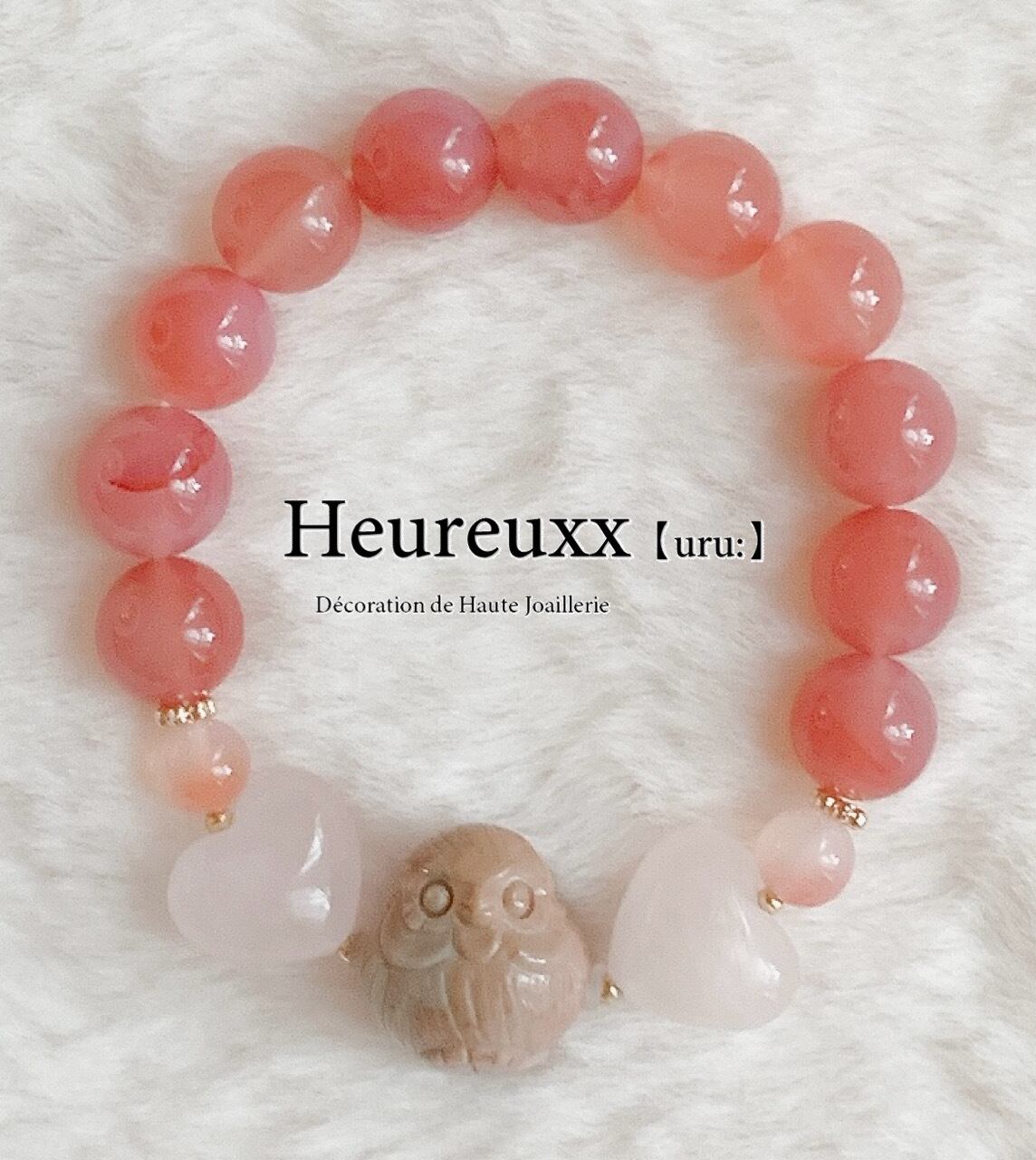 塩源瑪瑙にアラシャン瑪瑙の小鳥のパーツを合わせ、サイドにローズクォーツのハートを添えました❁⃘*.゚