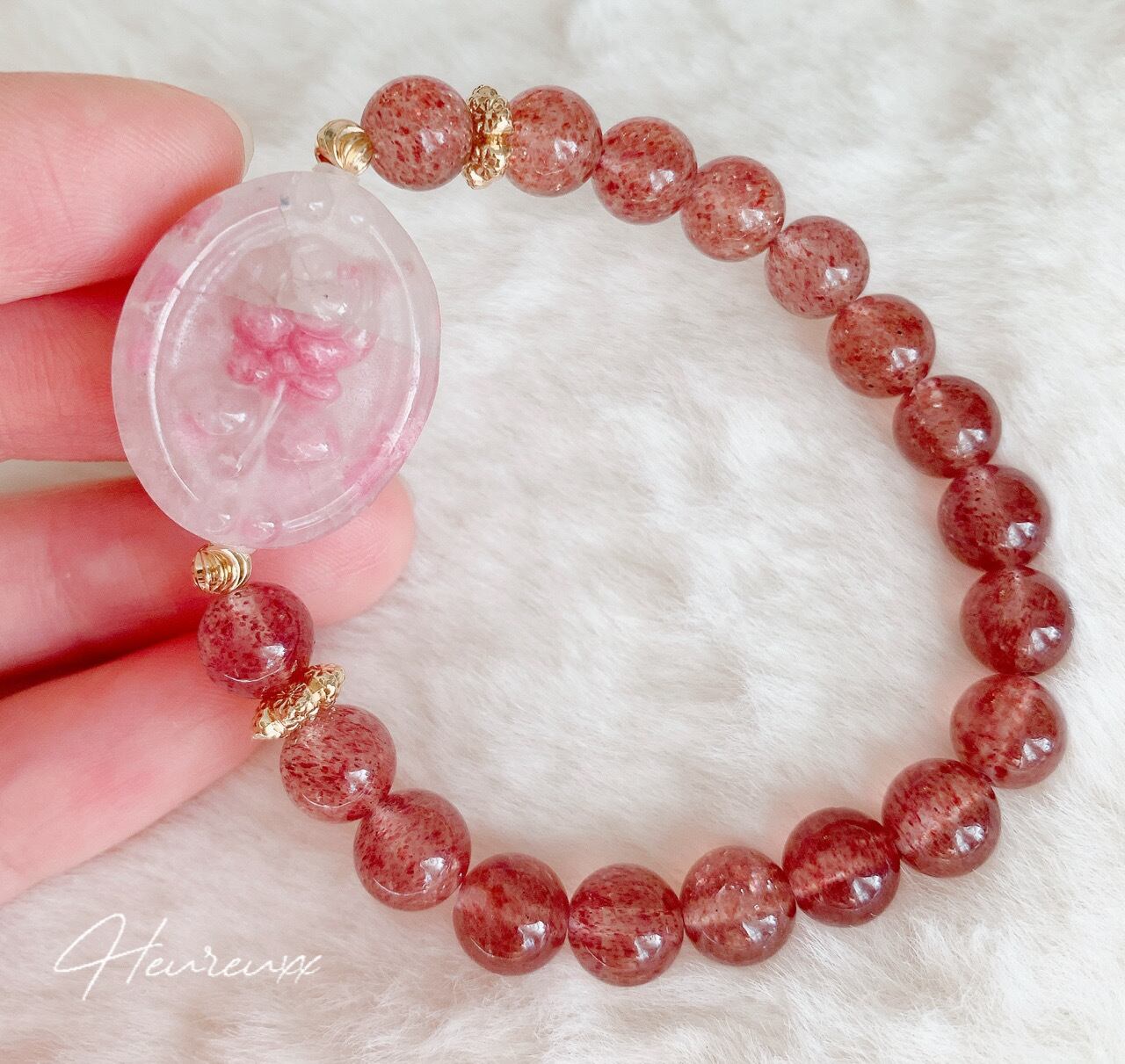 ストロベリークォーツは透明感があり、全粒マメの様なキラキラの鉱物が沢山入っておりとても綺麗です✧*。
